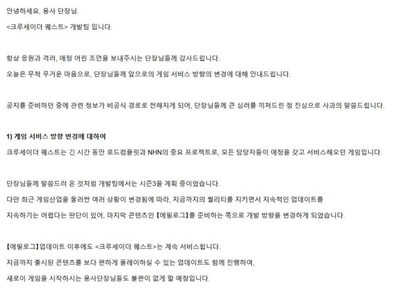 2023년 7월 25일 크루세이더 퀘스트는 개발 종료를 포럼에 다음과 같이 개시하였다.
