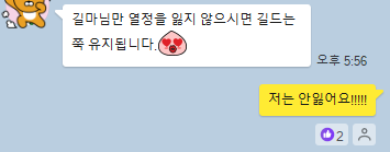 오픈 카카오톡을 처음 운영해보기도 하고 참 방 분위기라는 것을 어떻게 운영할지 역시, 길드장의 성격에 역시 크게 좌지우지되는 것 같습니다. 우리 길드 오카방은 조용히 게임하고 싶으신 분, 일상 이이기를 공유하고 싶으신 분, 게임과 전혀 관계없는 기사를 갑자기 공유하는 분, 여러 사람들이 혼재해있는 길드 오카방이었습니다. 다행이 정말 악의적인 목적을 가지고 무언가 게시하거나 그런 일은 없었고 다들 상식인이기에, 말은 안했지만 은근히 관계 없는 포스팅은 게임 관련 글을 마구 올려서 가린다던지, 식의 눈치(?)를 주며 서로 존중(?)하는 오카방을 만들 수 있었습니다.