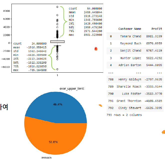 Profit을 중요 지표로 삼고 있으니, 어느 고객군이, 어느 물품에서, 어느 지역에서 가장 많은 이익이 혹은 손해가 발생하는지 알아내기 위해서 먼저 고객군을 나눌필요가 있었다. 고객별 Profit 총합을 확인하였고, Box Plot을 그려서 상위 이상치에 해당하는 사람들은 고래 고객군으로 분류하고 나머지는 일반 고객으로 분류하여 분석을 진행하였다. 또 일반 고객은 흑자, 적자 고객으로 나눠서 각각 비슷하게 분석을 진행해 주었다.