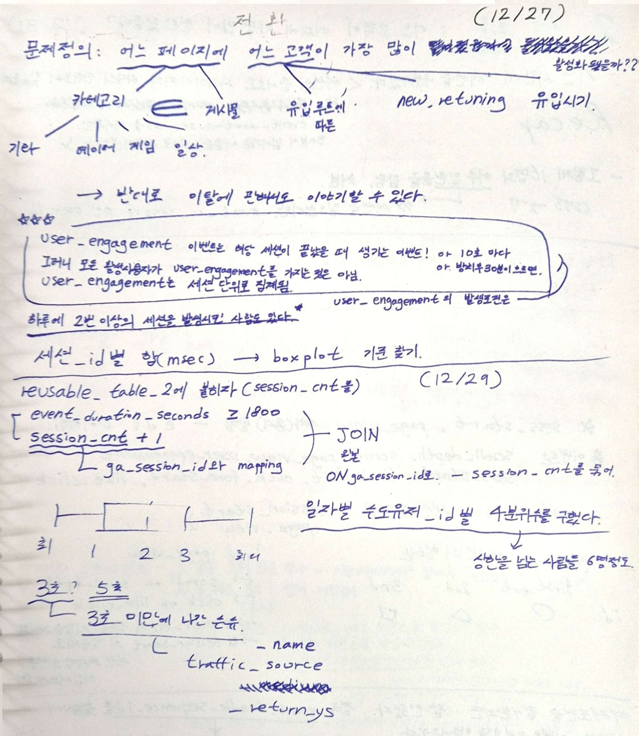 들어오자마자 나간. 이것을 정의하기 위해서, 들어와서 체류한 시간을 정의해줄필요가 있었습니다. 한 사용자가 들어와서 나가기(로 간주되는) 까지의 단위를 세션이라고 부르기 때문에, 정밀한 세션 구분 작업 및 체류 시간 계산을 다시 BigQuery 단계에서 또또다시 정제해주는 작업이 필요했습니다.